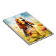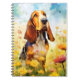 Colourful watercolor artwork of a Basset Hound sitting in a field of spring flowers.