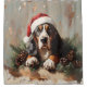 An adorable digital art of a basset hound in an oil painting style. The cute puppy dog is wearing a red and white Santa hat. A perfect winter and Christmas themed gift for dog lovers.