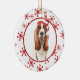 On the front of this Holiday ornament is a beautiful watercolor image of a soulful Basset Hound dog wearing a red and white striped Santa hat. The image is placed on a white circle framed by a retro red snowflake pattern. The back of the ornament has the same background and circle with your custom text in white on a matching red background. Cute, especially for someone who loves a Basset Hound.