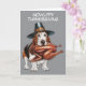 The image is generative content. I enjoy making basset hounds holding things in their mouth so I thought why not have the basset hound wearing a pilgrim hat and holding a turkey in its mouth for a thanksgiving design. The text on the front of the card and inside is able to be edited so you came personalise the design.