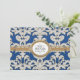 NOTE: This is a flat printed design. There are no actual jewels, buckles, frames, metal or layered items. It's all beautifully rendered through graphic design. COLOR PALETTE royal blue, cream, white sparkle look and warm silver metallic look. DESIGN MOTIF: Matching Bat Mitzvah Celebration invites. There is a complete wedding invitation set that has a wide range of products you can customise to match this invitation that has a gorgeous elegant formal look. This design would be especially stunning printed on the iced or champagne metallic paper. The design features an elegant gold dimensional jewellery style border frame in an oval shape with baroque carved etching swirls with the text "Bat Mitzvah" and the date with a calligraphy swirl Star of David softly in the background. This is an original art design by Audrey Jeanne Roberts that has a modern, contemporary, trendy and chic feel. It's a graphically designed version of a damask all over pattern, rendered in a sparkling, bling glitter look outlined with a thin golden metal looking band and overlaid on a bright background with a texture and a slight colour fade top to bottom. Many colour options are available. On the reverse side is a soft cream background, a matching gold and sparkling frame with a matching set of Spencerian handwriting flourishes, antique printer's ornament flourish swirling dove of peace bird, and a calligraphy typographic swirled decorative Star of David image. The text for your occasion is easily customised with your personalised names and information using the template fields provided.
