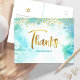 Make sure your favourite Bat Mitzvah shows her appreciation to all who supported her milestone event! Send out this stunning, modern, sparkly gold faux foil handwritten script and tiny dots overlaying a turquoise blue watercolor background, personalised thank you postcard. On the front, personalise with your Bat Mitzvah’s name. Add a personalised note on the back, either by modifying the sample copy or deleting entirely for a handwritten note. Guaranteed to add a stylish touch to her correspondence! Matching and coordinating invites, envelopes, address labels, stickers, place cards, table numbers, napkins, albums, and other Bat Mitzvah goodies are also available in this trendy and special collection.