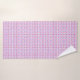 Bath set with towels hanging on silver bars, showcasing a vibrant geometric pattern in pink, purple, and orange hues, creating a lively, modern feel.