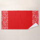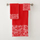 This bath towel set is shown in a vintage floral/leaf motif design in a blush and Hot Red colour.