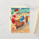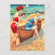 Vintage illustration of two bathing beauties at the beach in their latest swimsuit fashion. One poses on a rowboat while the other snaps a photo with a camera box.