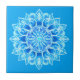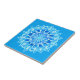 Ceramic tile in a batik textured mandala / medallion pattern in shades of aqua, turquoise and cobalt blue on a turquoise background