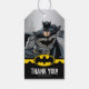 The greatest superhero of them all. This eye catching design of the famous Batman with a fearless look in his eye ready for any trouble that will come his way. Be as bold as Batman with these chalkboard thank you gifts tags, designed by DC Comics. Show your friends your appreciation and the perfect way to end your super (hero) party.