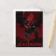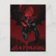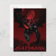 This powerful graphic illustrates Batman in a dynamic action pose, leaping against a backdrop of a blood-red moon and a stormy Gotham skyline. The illustration is steeped in shades of red and black, emphasizing the intensity and danger of the moment. Batman is depicted in full motion, grappling hook in hand, ready to confront the perils that lurk in the night. The city below him is rendered in a detailed wireframe style, suggesting its complexity and the depth of secrets it holds. Rain slashes across the scene, adding to the dramatic tension and the feeling of a high-stakes battle against crime. The artwork conveys Batman's relentless drive and his role as a dark hero in a city that never sleeps, capturing his essence as Gotham’s silent guardian and protector.