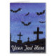 A tiny watercolor landscape of bats in flight over a cemetery at night.