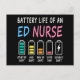 Humorous shift display showing the battery levels of an ED nurse, also known as an emergency department nurse, with colorful levels from start to double shift. Ideal for emergency staff who enjoy relatable workplace humor.