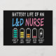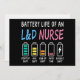 Humorous shift chart showing the battery life of an L&D nurse, also known as a labor and delivery nurse, with colorful levels from start to double shift. Ideal for maternity and birthing staff who enjoy relatable workplace humor.