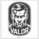 This bold, black-and-white sticker design captures the raw intensity of a battle-hardened commando. Featuring a rugged face with piercing eyes, a scarred eyebrow, and a gritty, textured finish, the illustration exudes resilience and determination. Framed by a cracked military dog tag inscribed with “Valour,” this graphic is set against a transparent background, perfect for a striking, wearable statement piece that celebrates strength and courage.