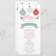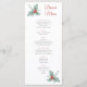 Pretty snowflake crested Christmas holiday baubles in mint green, light grey and dusky red are the focus of this wedding reception menu design which also features a banner for the bride and groom's names with the details below. The appetizers and signature drinks menu is on front and the full dinner menu is continued on back with holly boughs at the top and bottom opposite corners.