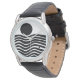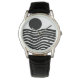 This men's watch has Bauhaus design of wavy lines and circles in black on a field of white.
