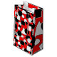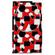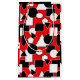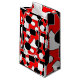 This gift bag has a Bauhaus design of triangles, circles, rectangles, and pentagons in black and white on a field of red.