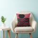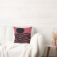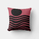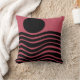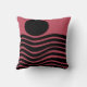 This throw pillow has Bauhaus design of wavy lines and circles in black on a field of deep pink.