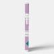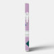 This phone case has a Bauhaus design of diamonds on purple strips with a design meant to look like quilting.