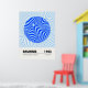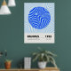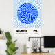 Minimalist Bauhaus-style poster featuring geometric blue circular patterns, advertising the 1923 exhibition held from July to September.