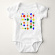 This baby bodysuit has a Bauhaus design of a grid with shapes in red, yellow, orange, green, and blue plotted on it.