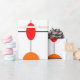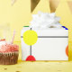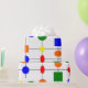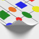 This wrapping paper has a Bauhaus design of a grid with shapes in red, yellow, orange, green, and blue plotted on it.