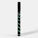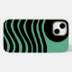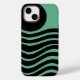 This phone case has Bauhaus design of wavy lines and circles in black on a field of seafoam green.