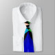 This necktie has a Bauhaus design of random shapes in blue, teal, yellow, red, and orange.