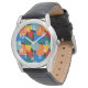 This men's watch has a Bauhaus design of random shapes in blue, teal, yellow, red, and orange.