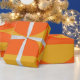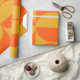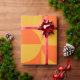 This wrapping paper has a Bauhaus design of squares and circles in yellow and orange.