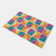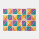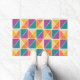 This doormat has a Bauhaus design of squares made of triangles in shades of orange, yellow, purple, and blue.