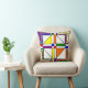 This throw pillow has a Bauhaus design of lines, triangles, diamonds, and squares making a stained glass look in primary and secondary colours.