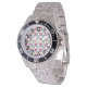 This men's watch has a Bauhaus design of repeating triangles in gold, turquoise, teal, purple, and light gold. If you like the design but prefer different colours, message me.