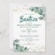 Announce your child's Baptism or Christening with this elegant greenery invitation, adorned with watercolor green leaves and a gold cross. Ideal for a Catholic religious celebration. Available in Spanish.