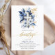 Modern and Elegant Spanish Baptism Invitation. This beautifully designed invitation features the word "Bautizo" in handwritten gold lettering. The design is adorned with exquisite watercolor navy blue and gold flowers, complemented by a delicate gold and blue cross, all set against a pristine white background. Personalise the invitation further with your celebration details to create a truly unique and memorable keepsake.