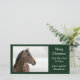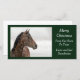 Photograph of a bay horse standing in a snowy field in gently falling snow. Customisable text and background colour.