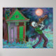 Bayou Blues Poster by Laura Barbosa. A Skeleton Musician Playing the Blues in the Bayou on his Trombone. Hand Painted in Acrylics on 24 × 30″ Gallery Wrapped Canvas. This is an Original Painting by Laura Barbosa. Celebrating life and Death on the Bayou with a Floating Home, Colourful Owl, Cool Tree, Decorative Waves, a Bright Sun and Rich Background. Dark Art Leading Us Into the Light!