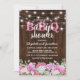 Country barbecue baby shower invitation featuring a rustic wood background, backyard string lights, elegant pink and white garden watercolor flowers, and a couples baby shower celebration template that is easy to personalise.