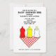 Creative summer BBQ baby shower invites featuring barbecue gear and funny baby bottle.