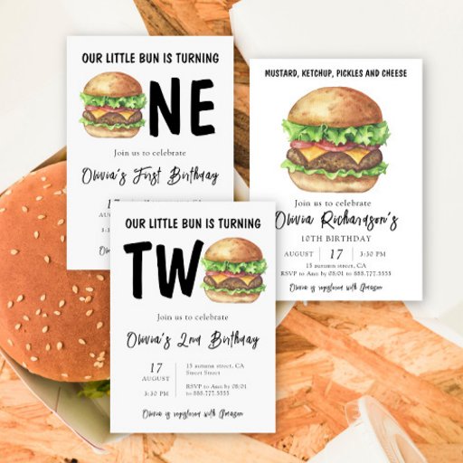 Birthday Party. Invite guests to a birthday party in style with our cheeseburger birthday party invitations. Watercolor hamburger.