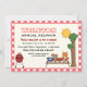 BBQ cookout picnic family annual reunion invitation with red gingham or vichy border featuring a whimsical table with chequered tablecloth and burgers, potato salad, watermelon and orange juice on it, a red gas barbeque grill, a tree and the sun. Great for a summer picnic. Art elements by Alice Smith.