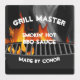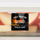 A graphic illustration of a flaming barbecue grill by artist/designer Charmaine Paulson on a BBQ sauce label.