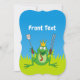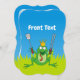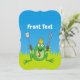 Prince frog with BBQ tools, tongs and spatula over green grass under blue sky.