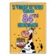 "I 'herd' it was your 84th birthday!" fun b-day cow holding a birthday cake greeting card.