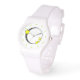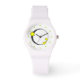 Accessorise with this very cute celestial timepiece for any occasion. Four yellow stars on a black crescent moon, surrounded by green dots, on a white background.