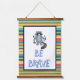 Adorable nursery or kids room wall tapestry features Boho Racoon with his bow and arrows, "Be Brave" text and multicolored striped background