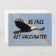 Be Free Get Vaccinated Flying American Bald Eagle personalised pro vaccination postcard features a flying American Bald Eagle.The text "Be Free" is above the eagle and "Get Vaccinated is below the eagle. The background shows a sky with a colourful rainbow. This pro vaccination political statement postcard is entirely customisable. You can change the images and the text and add your own. Look for more cool T-shirts, cards and gifts in our store at zazzle.com/VicesAndVerses.
