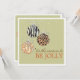 A modern design of dangling Christmas ornaments in contemporary animal print patterns of cheetah, zebra and giraffe, all tied in swirling bows, on a sage green background. This invitation is sure to bring a smile to your guests as it welcomes them to your house to Be Jolly together. Perfect for personal or business get-togethers. Be sure to check out these matching items for a truly coordinated look: