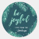 Hand-drawn pine branches in soft green watercolor paired with calligraphic "be joyful" typography against a textured dark blue background makes for a bright and modern holiday design.