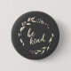 Stylish and minimalist button featuring the inspirational kindness quote - Be Kind - in beautiful script hand lettering inside of a modern floral wreath in cream on a black background.