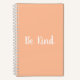 This notebook has an inspirational quote that reads, "Be Kind" in white font on peach. It's a great notebook for a student or dreamer of any age and is perfect for work, back to school, journalling or as a diary. It's always good to have a reminder to be a positive for in peoples lives and to be good. Give as a gift to someone who likes positive affirmations or a student for as a school supply. #inspirational #inspirationalquote #motivationalquote #aspirational #positiveaffirmation #goodvibes #postivemindset #positivevibes #bekind