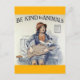 Vintage illustration of a young woman sitting on a bench, holding a dog wrapped in a blanket with the title "Be Kind to Animals" The illustration is by Morgan Dennis and was distributed by the State Humane Office of Madison Wisconsin